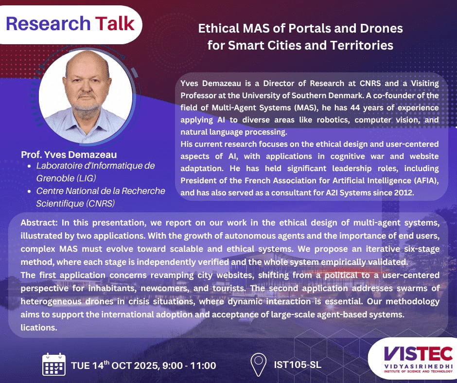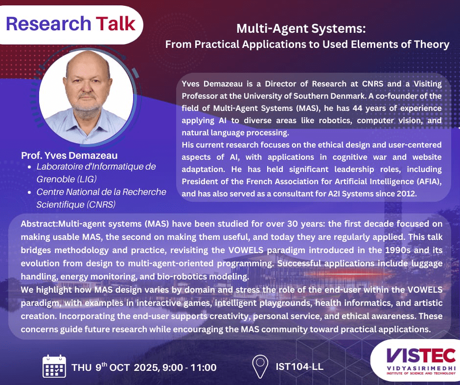 We are pleased to announce a series of research talks by Prof. Yves Demazeau, Director of Research at the Centre National de la Recherche Scientifique (CNRS) and co-adviser of our research group. The sessions will take place this October at the IST Building, covering fundamental and emerging topics in multi-agent systems (MAS) and AI ethics.