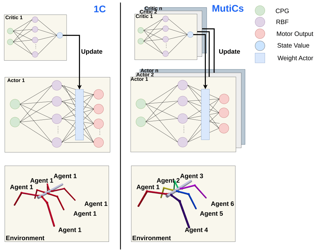 In this work investigates a data-driven locomotion framework that integrates reinforcement learning (RL) with biologically inspired central pattern generators (CPGs) for legged robots. CPGs provide stable rhythmic motion, while RL modulates CPG parameters to enable rapid adaptation to environmental changes and morphological variations. By employing CPG–RBF networks and multiple value functions, the framework aims to improve learning efficiency and robustness compared to conventional single-critic approaches, particularly in multi-agent or decentralized control settings. Although evaluated in generic legged robotic platforms, the proposed method is broadly applicable to bio-inspired systems requiring adaptive and resilient locomotion