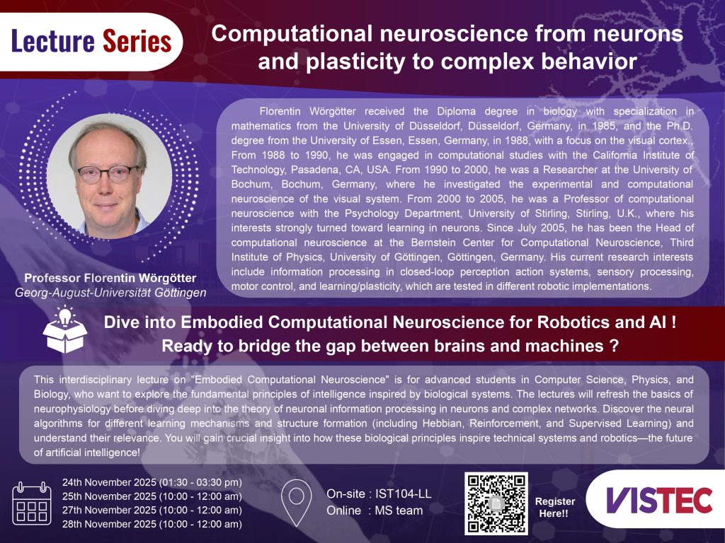 November 20, 2025 Thirawat Chuthong SS-PAIR-VII: Embodied Computational Neuroscience Invited Speaker: Professor Florentin Wörgötter Talk Highlight Recorded video Computational neuroscience_Prof_Florentin_Woergoetter